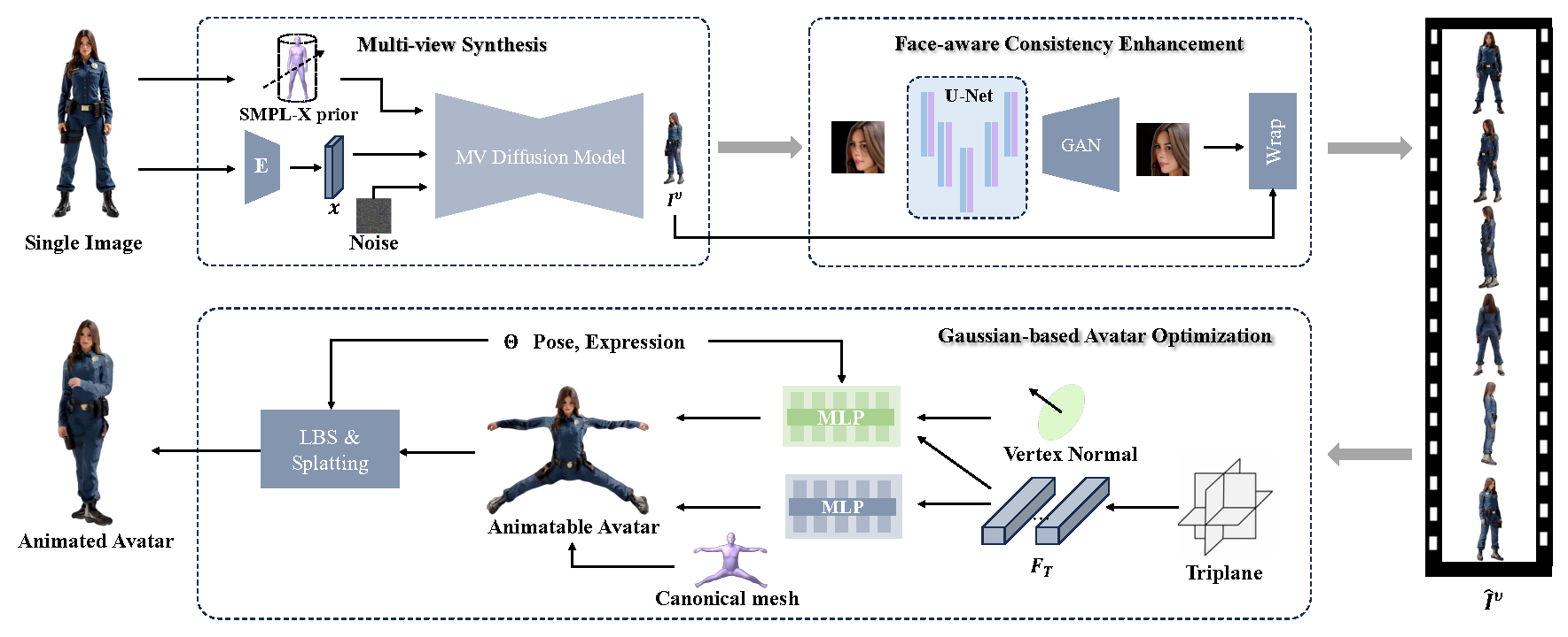 Overview of the Photo2Avatar framework. Starting from a single input image, the system synthesizes multi-view portraits guided by SMPL-X priors. A face-aware enhancement module improves cross-view identity consistency, and the enhanced views supervise the learning of a controllable 3D Gaussian avatar.